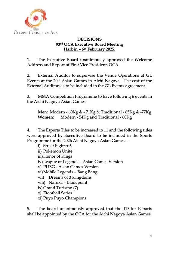委員會(huì)還一致決定解散由OCA任命的、負(fù)責(zé)確定2026年愛知名古屋亞洲運(yùn)動(dòng)會(huì)電子競(jìng)技項(xiàng)目的工作組(Task Force),因?yàn)殡娮痈?jìng)技項(xiàng)目已由OCA執(zhí)行委員會(huì)批準(zhǔn)。